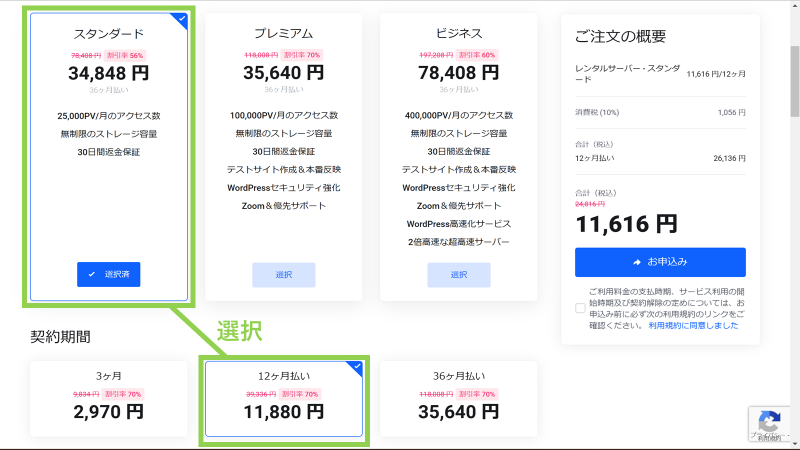 プレミアムやビジネスを選択してもいいですが、ブログ運営の場合は、スタンダードで十分です。